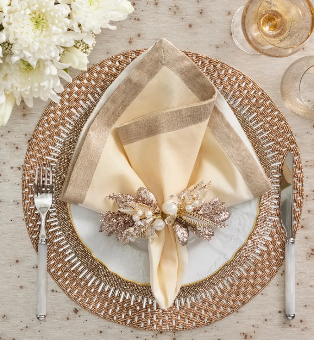Kim Seybert designs artisan-made tabletop decor and luxury home accessories. Create a well-dressed dining look with the brand’s range of elegant tableware, placemats, runners, chargers, plates, napkins, flatware, and more. The metallic Gilded Spray Napkin Ring in Gold & Silver, Set of 4 is a modern take on classic holiday entertaining. Dress up the holiday table with these glitzy pearls, baubles and spectacular beaded sprays. Whether you’re throwing a winter white-themed holiday dinner or having a winter wedding, this napkin ring is the perfect glamorous accent.