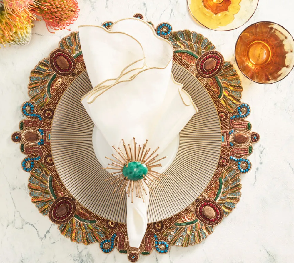Kim Seybert designs artisan-made tabletop decor and luxury home accessories. Create a well-dressed dining look with the brand’s range of elegant tableware, placemats, runners, chargers, plates, napkins, flatware, and more. The simplicity of the Luminance Napkin, Set of 4 is enhanced by its metallic finish, featuring a soft, rounded hem with contrast metallic stitching.