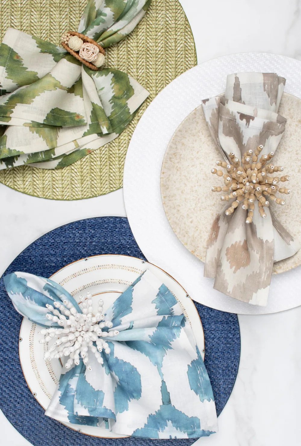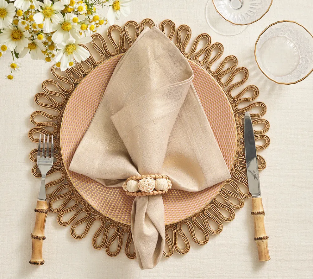 Kim Seybert designs artisan-made tabletop decor and luxury home accessories. Create a well-dressed dining look with the brand’s range of elegant tableware, placemats, runners, chargers, plates, napkins, flatware, and more. The beach-themed Playa Napkin Ring in Natural, Set of 4 is handwoven with natural materials to form a unique design that coordinates nicely with any coastal decor for the dining table.