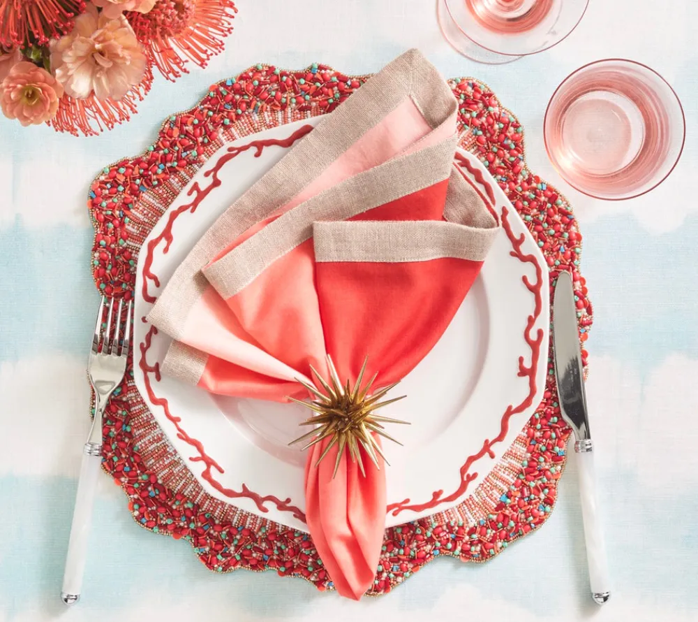 Kim Seybert designs artisan-made tabletop decor and luxury home accessories. Create a well-dressed dining look with the brand’s range of elegant tableware, placemats, runners, chargers, plates, napkins, flatware, and more. The Reef Chic Placemat in White, Coral & Turquoise, Set of 2 captures the organic beauty of coral formations from coastal destinations. From embroidered patterns to ten unique glass-beaded elements, each handcrafted detail presents a seamless blend of island-inspired style in every setting.