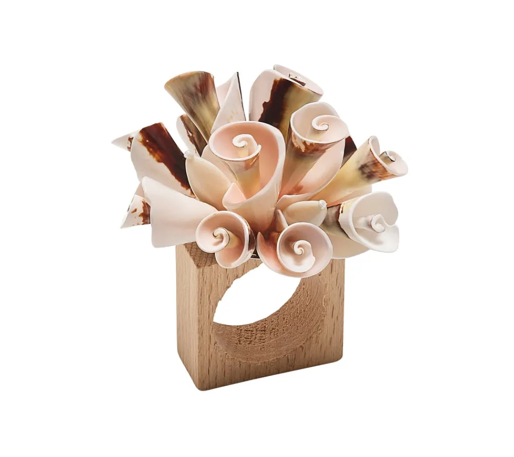 Kim Seybert designs artisan-made tabletop decor and luxury home accessories. Create a well-dressed dining look with the brand’s range of elegant tableware, placemats, runners, chargers, plates, napkins, flatware, and more. Bring the essence of the sea to your dining table this season with the Sea Shell Burst Napkin Ring in Ivory & Natural, Set of 4. Featuring clusters of spiral shells in various sizes and soft hues resting atop a wooden base, it fits in nicely at seaside gatherings, beach weddings and summer soirées. As the shells are naturally occurring, each piece boasts unique variations in design. No two napkin rings will be exactly alike.