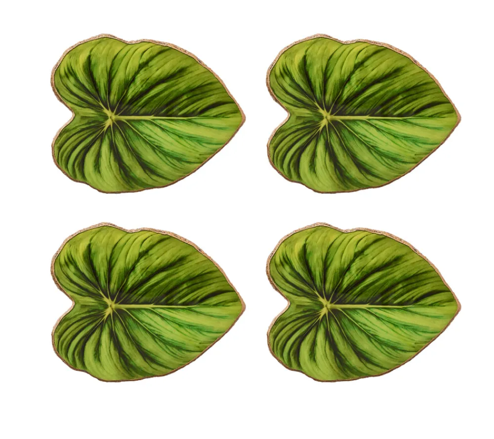 Kim Seybert designs artisan-made tabletop decor and luxury home accessories. Create a well-dressed dining look with the brand’s range of elegant tableware, placemats, runners, chargers, plates, napkins, flatware, and more. Like the coordinating Tropicana Placemats, the Tropicana Drink Coasters in Green, Set of 4 feature a heart- shaped tropical leaf design, which is printed on acrylic and backed with cork for protection. The vibrant green hue and radiating veins on the frond give these coasters a distinct look. Because of the acrylic coating, the coasters are easy to clean with just a quick swipe of a wet cloth.