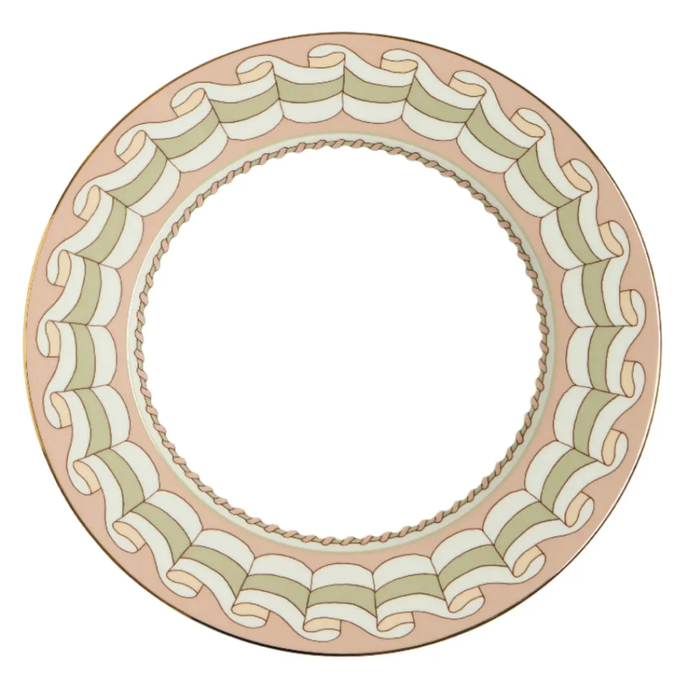 The inspiring authority on feel-good fashion, energy elevation, and the ebullient Italian way of life, La DoubleJ was launched in 2015 by J.J. Martin. Beginning as a magazine, the brand soon took flight in 2017 with original collections of new fashion and homeware with in eye-popping prints, cut with easy glamour. The Charger Plate in Poseidon Dusty Pink is both functional and decorative, crafted from fine Italian porcelain and trimmed with hand-painted 18K gold. Inspired by the mighty God of the Sea, this generously sized piece serves as a dramatic base for layered place settings or as a bold serving platter—especially when paired with other prints from the Napoli Rosa family.