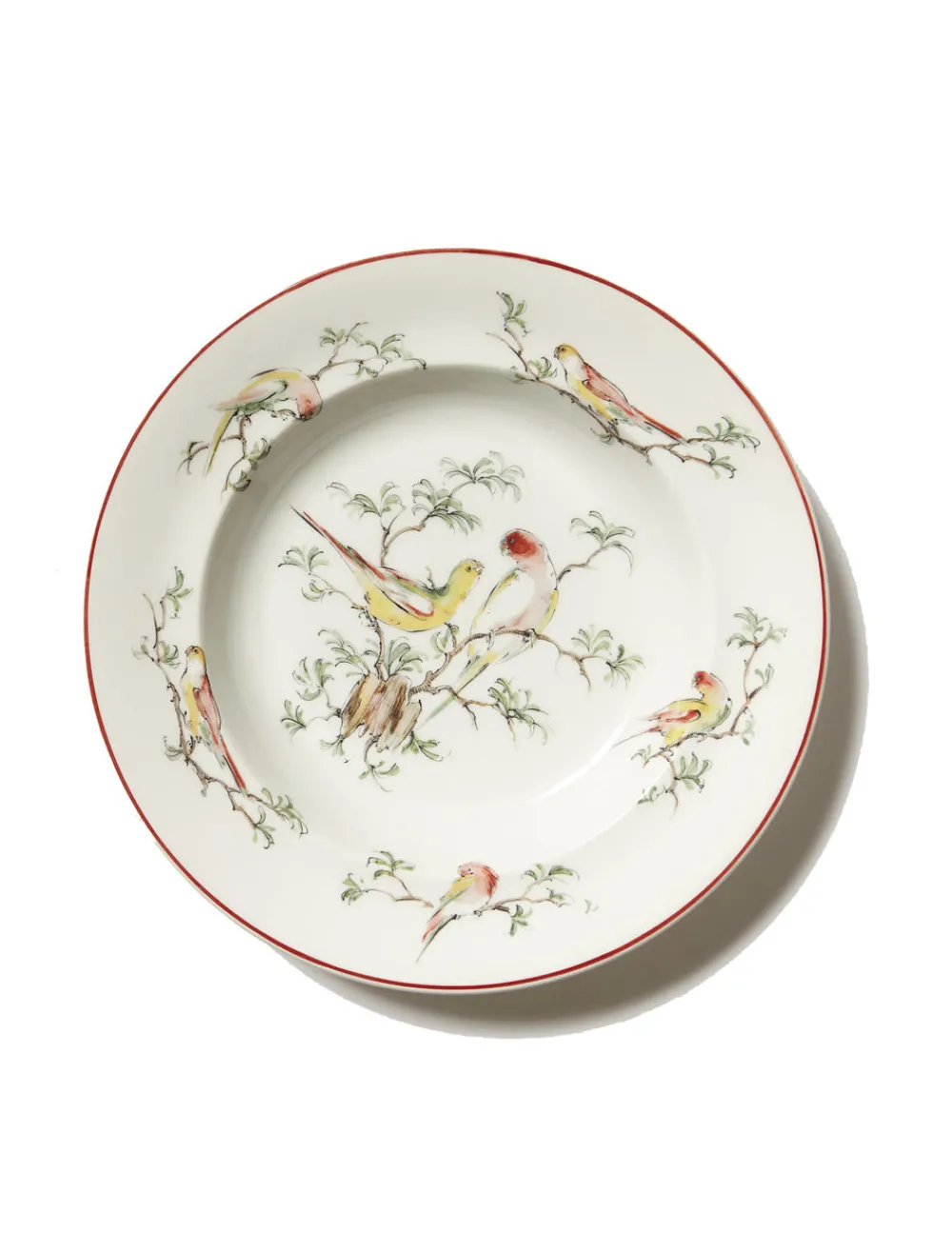 Entirely handcrafted and hand-decorated by artisans at the Milanese ceramic workshop Paravicini, this soup plate has a whimsical, Old-World feel. The detailed design depicts vibrant budgie birds perched among foliage on smooth white ceramic with a bright red border.