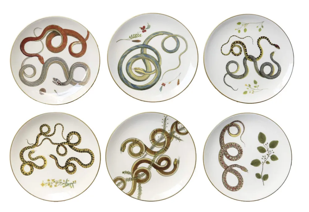 Illustrated snake design and gilded edge. Ceramic. Set of 6. Handcrafted in Italy.