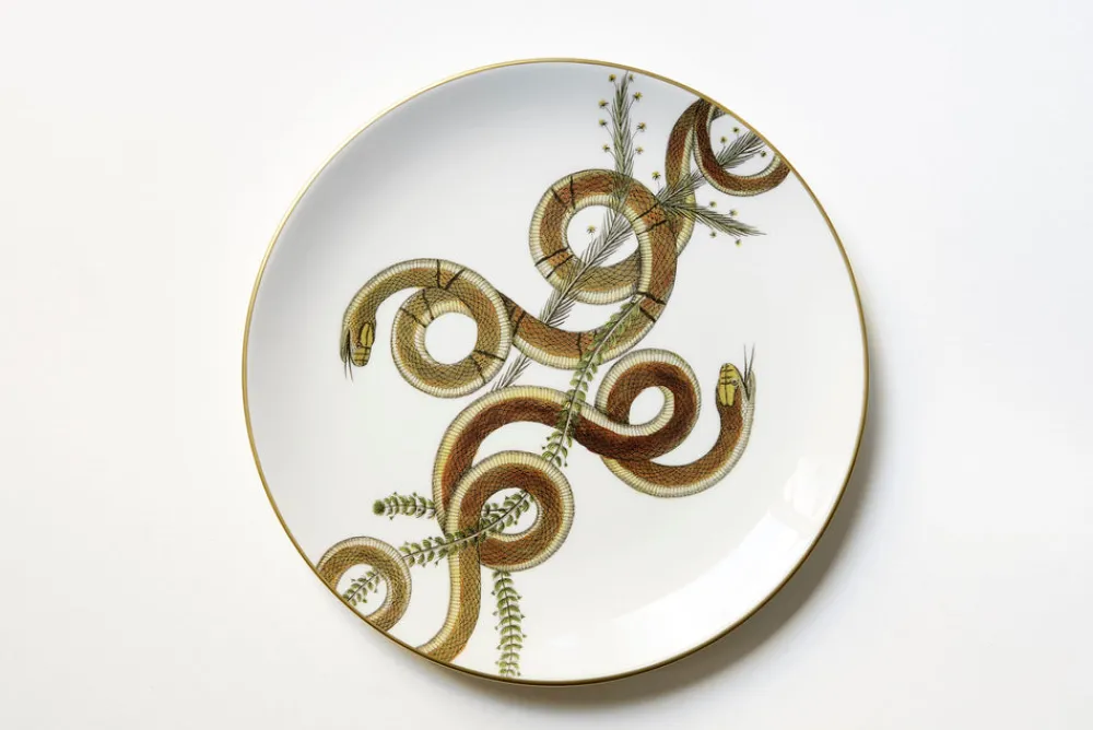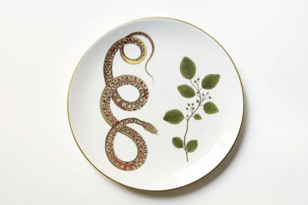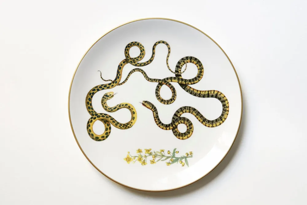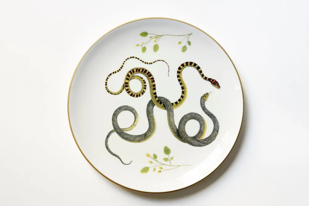 Illustrated by a different snake design—meant to symbolize transformation and the continual renewal of life—each of Costanza Paravicini’s striking Serpentine Dinner Plates is handcrafted and hand-decorated by artisans at the family’s ceramic workshop in Milan. With a glossy finish and gilded edges, this set of 6 will add sophistication to any modern place setting and is sure to be a conversation starter when you gather around the table.