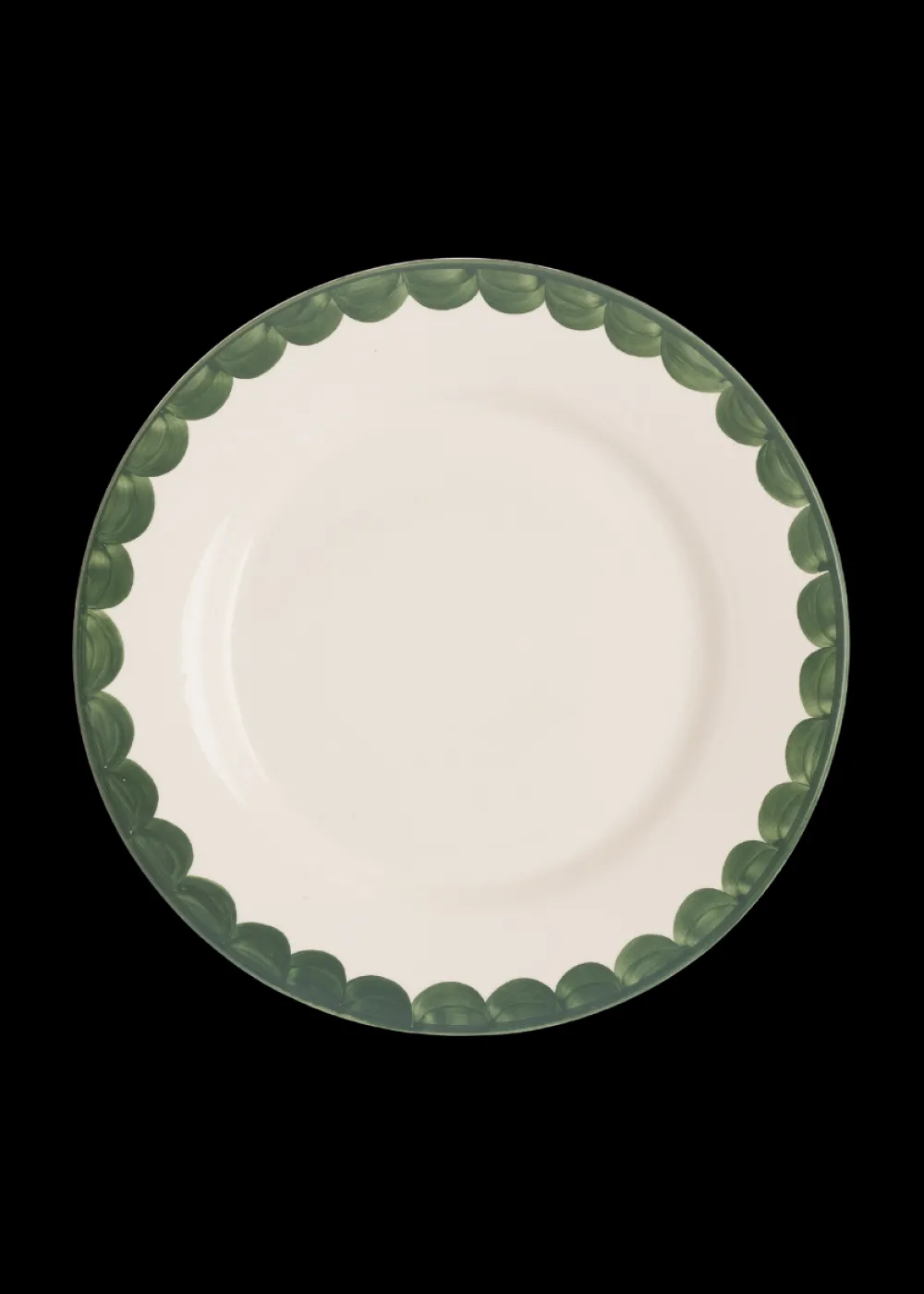 28 cm dinner plate with scalloped edge and a well. Hand-painted in green using toxin-free glazes. Crafted in Portugal by artisans, reflecting the Iberian ceramic tradition. Matching side plates and bowls available.