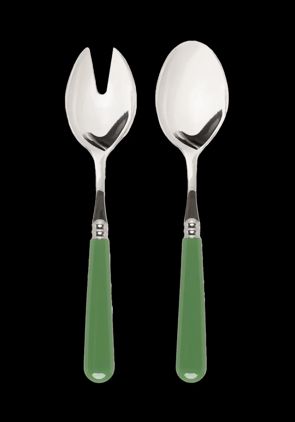 Stainless steel salad servers with green handles. Made in France by a family business in the traditional knife-making region. Dishwasher safe up to 50°C. Matching knives, forks, and dessert spoons available to complete the set, or mix and match with other colors for an eye-catching table.