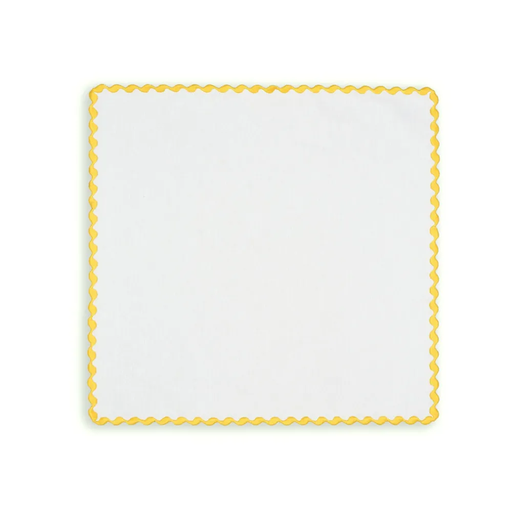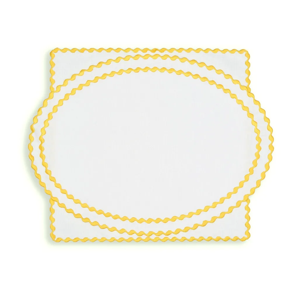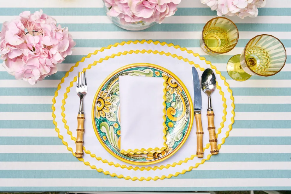 To enliven your tabletop and the conversation, look to Loulou La Dune. Based in Istanbul, Aylin Cinarli Duna’s architectural background provides the outlook for the brand’s luxury linens and beautiful hand embroidery. Her embrace of unique artisanship, and only the finest materials, adds elements refined craftsmanship to your bedroom, bathroom, kitchen and living spaces. Ideal for family gatherings and dinner parties, the Cora Placemat And Napkin Set In Sunshine yellow features an imaginatively scalloped edge, and a double layer of delightful rose trim. Works year-round, but we especially love it for a warm weather luncheon al fresco.