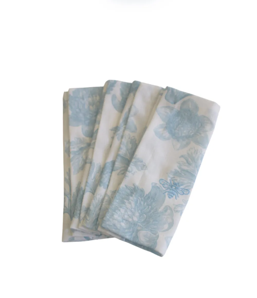 “Pretty & practical,” Maggie Bentley Designs brings an eclectic charm to everyday dressing, inspired by the color, history, and coastal beauty of Charleston. With a focus on cheerful, hand-drawn prints and timeless silhouettes, each piece blends Southern sensibility with effortless style. Designed to entertain, these thoughtful staples celebrate joy, pattern, and personality in equal abundance. The Garden Toile Napkins with Embroidered Bee, Set of 4 features a custom garden toile print in soft cornflower blue with a delicate embroidered bee detail, created in collaboration with artist Lily Oake.