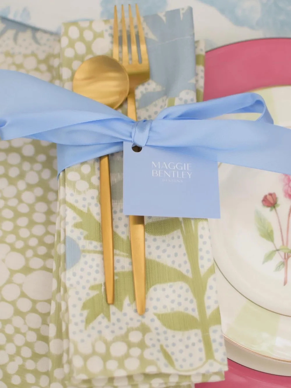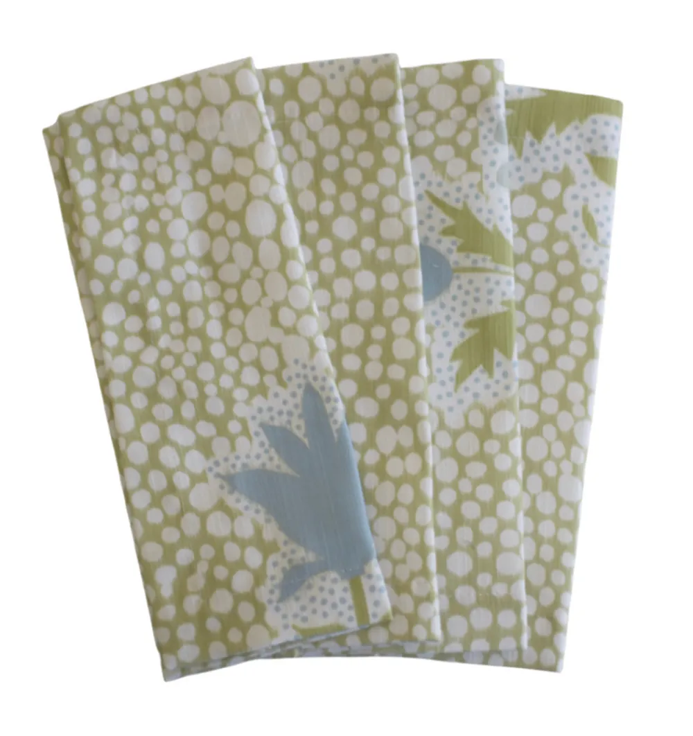 “Pretty & practical,” Maggie Bentley Designs brings an eclectic charm to everyday dressing, inspired by the color, history, and coastal beauty of Charleston. With a focus on cheerful, hand-drawn prints and timeless silhouettes, each piece blends Southern sensibility with effortless style. Designed to entertain, these thoughtful staples celebrate joy, pattern, and personality in equal abundance. The Shagreen Tulip Napkins, Set of 4 features a custom-designed shagreen tulip pattern in bright sage and cornflower blue, created in collaboration with artist Danika Herrick. The large-scale print ensures each napkin is uniquely composed, bringing a one-of-a-kind charm to any table setting.