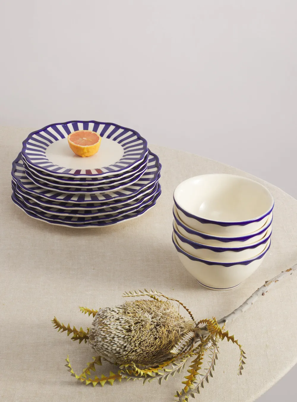 Ceramic stoneware. Four each: Jane Dinner Plate; Jane Side Plate; Jane Cereal bowl. Made in Portugal. Due to the handmade nature of the item, slight variations may occur.