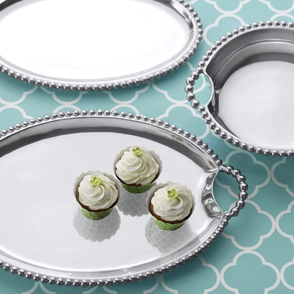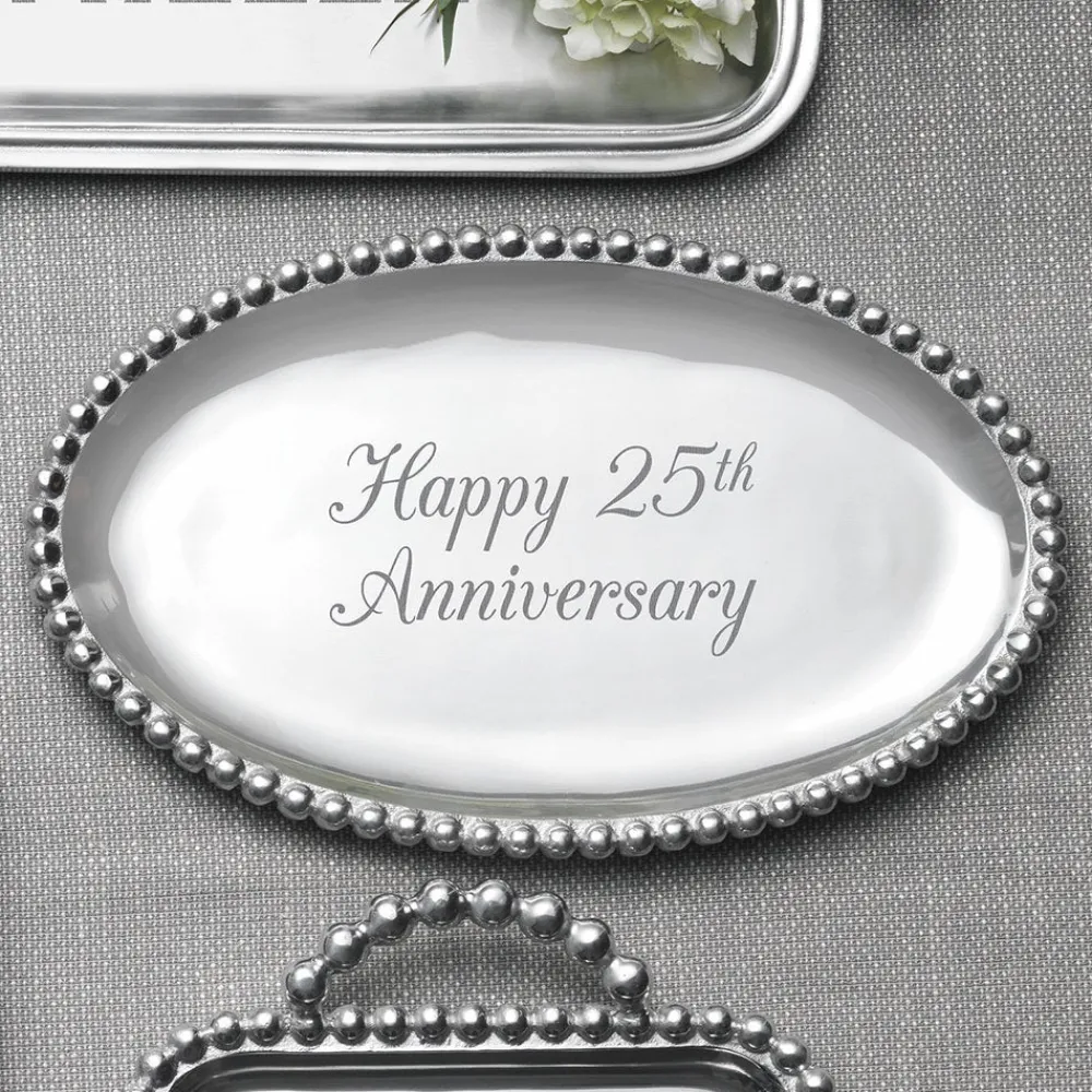 Known for its unique range of decorative homewares, handmade by artisans and notable designers from only recycled materials, Mariposa has been a leader in sustainability and style since its founding in 1983. Part of the brand’s signature String of Pearls Collection, the engravable Pearled Oval Platter is celebration of sleek design with a twist, featuring a rich pearled border.