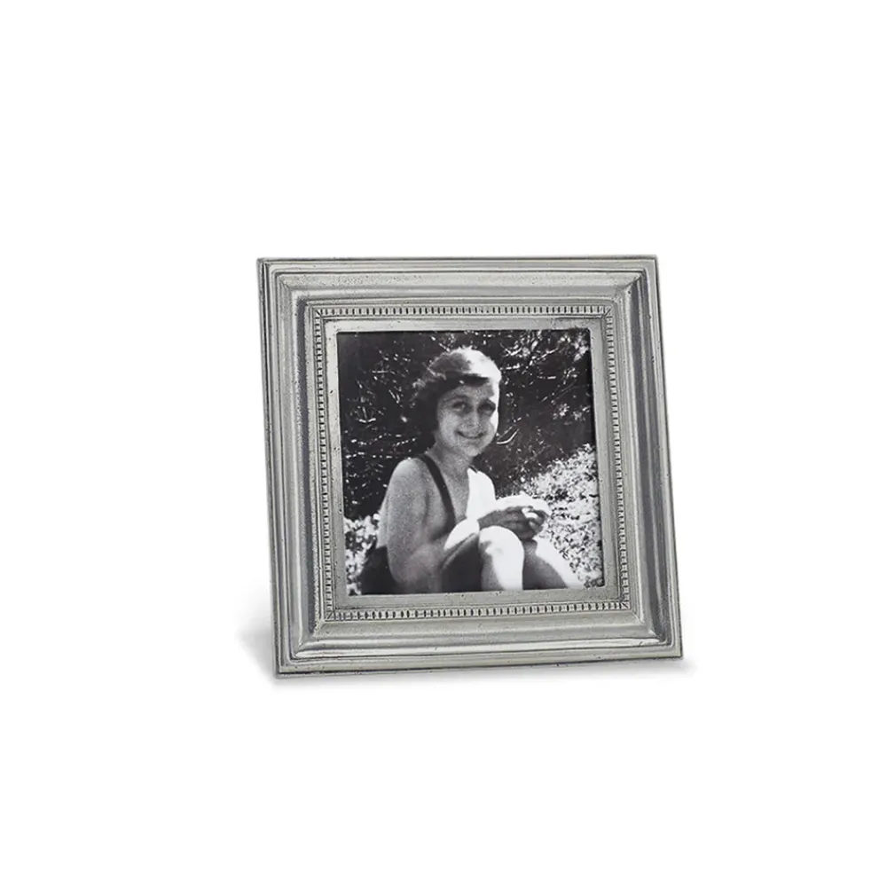 The Toscana Square Frame is a beveled Italian pewter picture frame embellished with an inner border of luxe square beads. A must-have for the ultimate hostess, MATCH pewter—a valuable metal composed of tin, copper, and antimony—is handmade by artisans in Northern Italy. Each piece is made with an alloy that is food safe lead-free, FDA approved and requires very little care. Every piece of Match pewter is marked with the manufacturer’s “M” hallmark as well the mark of tin content “95.”