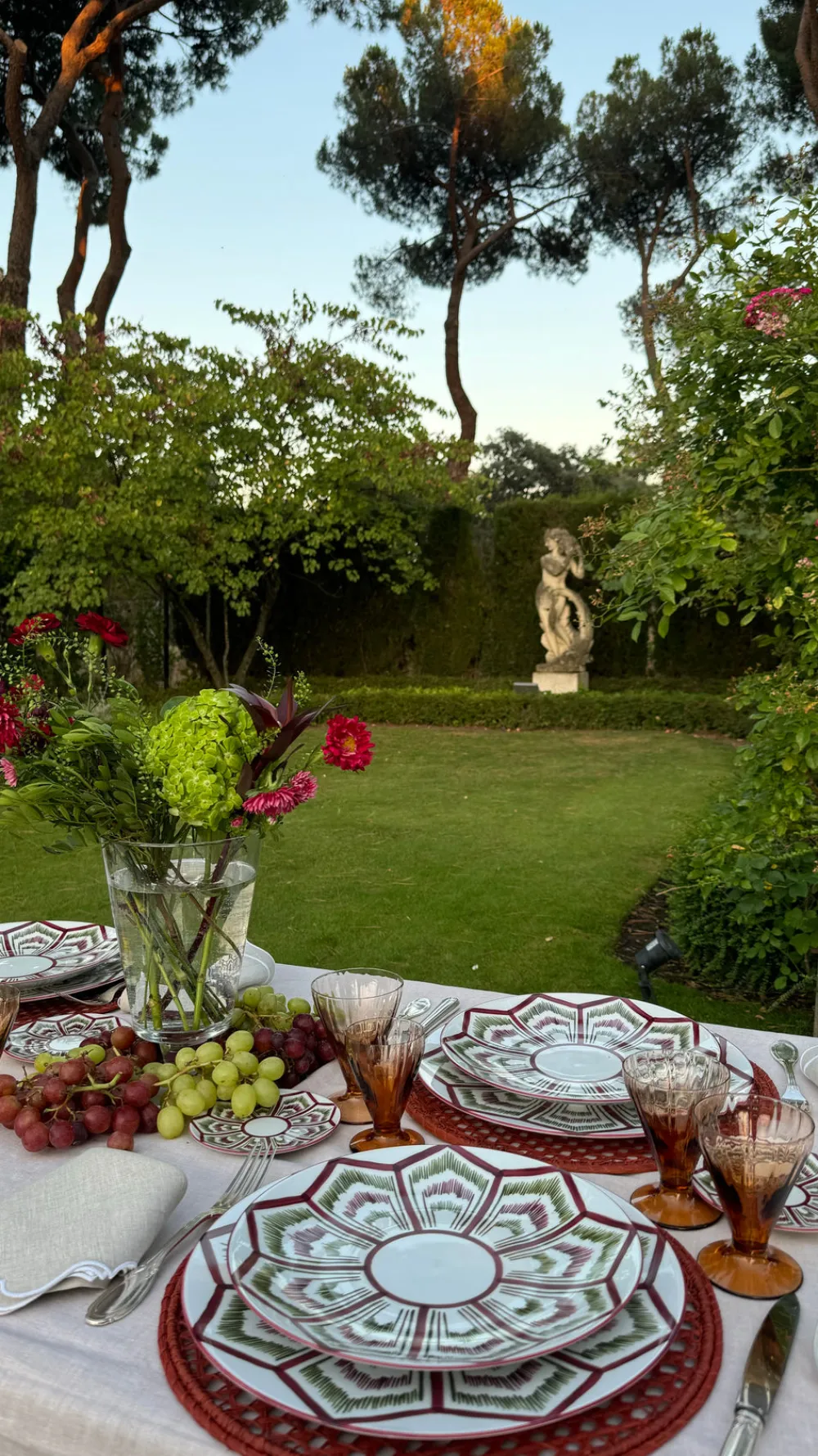 Molecot’s sophistication arrives by way of its founders, three Spanish businesswomen and friends, who sought to augment the art of entertaining with fine tableware. Inspired by trips across the world, fashion, and art, every occasion becomes unique with these pieces’ embrace of both tradition and contemporary style. Inspired by the Majorcan classical fabric of tongues, the Mallorca II Charger Plate features a vibrant burgundy and olive green, characterized by a geometric decoration that evokes an ikat design. Crafted in Limoges porcelain and hand-painted, the Green Punk Charger Plate is ideal for serving larger, family-style items, or acting as the base for other dishes.