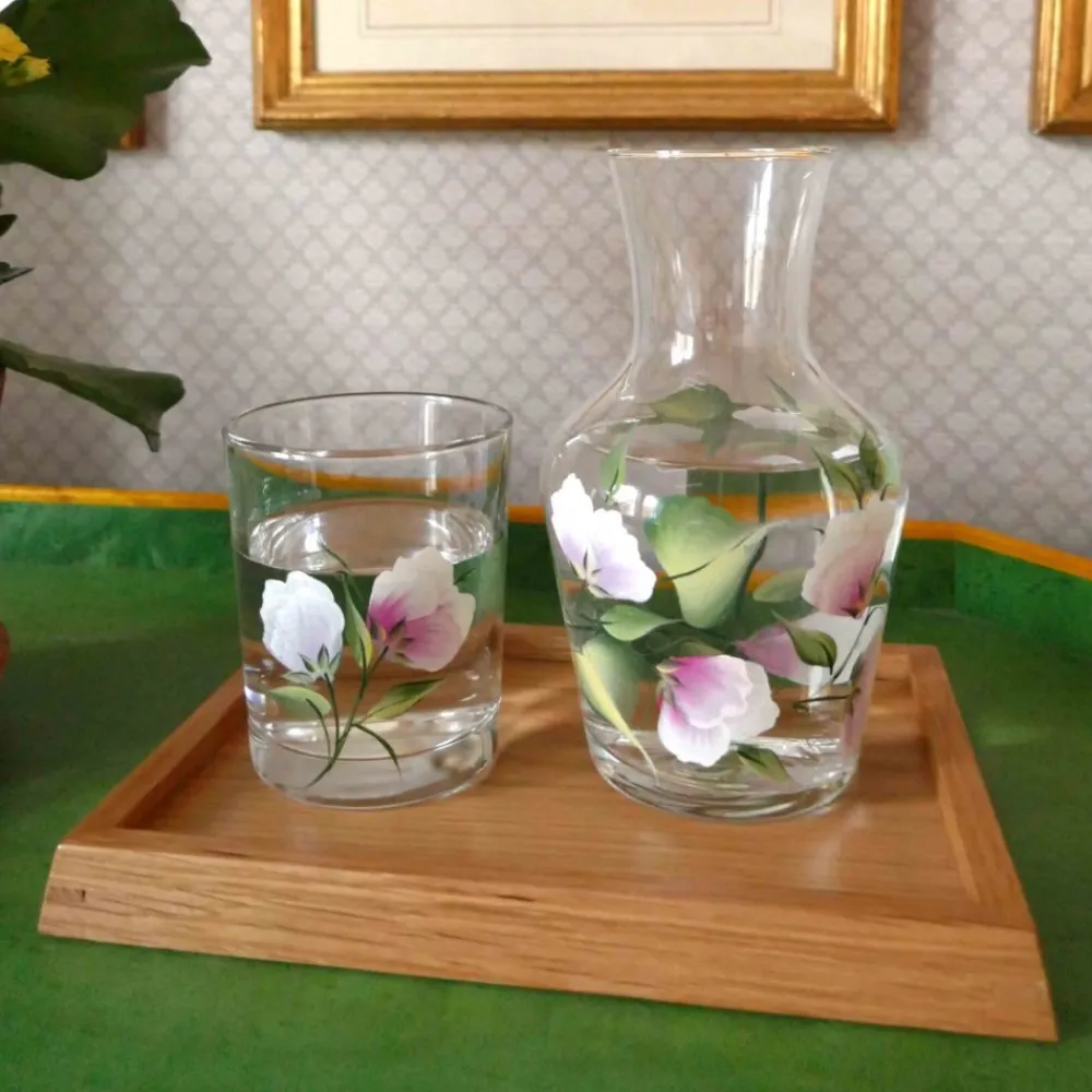 Each carafe and tumbler is handmade in France and hand-painted in the U.K. with non-toxic ink.