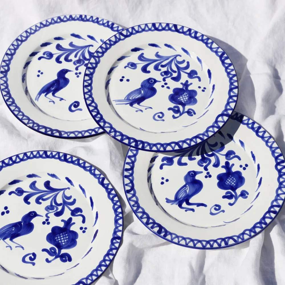 Using ancient techniques and Lebrillo motifs that date back to the 16th century, each Pomelo Casa piece is handmade and hand-painted by only five small, family-run workshops in Granada. For the first time, they are being exported outside of Europe, so that the gorgeous, simple, timeless patterns of Southern Spain can be shared with the world, making it brighter in the process. Casa Blanca & Negra Dinner Plate with Traditional Designs features pastoral scenes—birds and pomegranates—and delightful pattern in a deep shade of blue. Because of their handmade nature, each piece may have a slight variation in pattern as a result. Minor imperfections are not considered flaws but instead add to the authenticity and charm of these beautiful home goods.