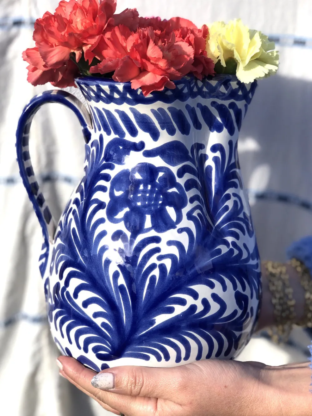 Hand-painted with a traditional Spanish design featuring birds and flowers, the Casa Azul Large Pitcher is subtly striking and well-suited for dining or table decoration. Each Pomelo Casa piece is handmade in Southern Spain by ceramicists who have been using the same techniques for over five centuries and may have a slight variation in pattern as a result. Minor imperfections are not considered flaws but instead add to the authenticity and charm of these beautiful home goods.