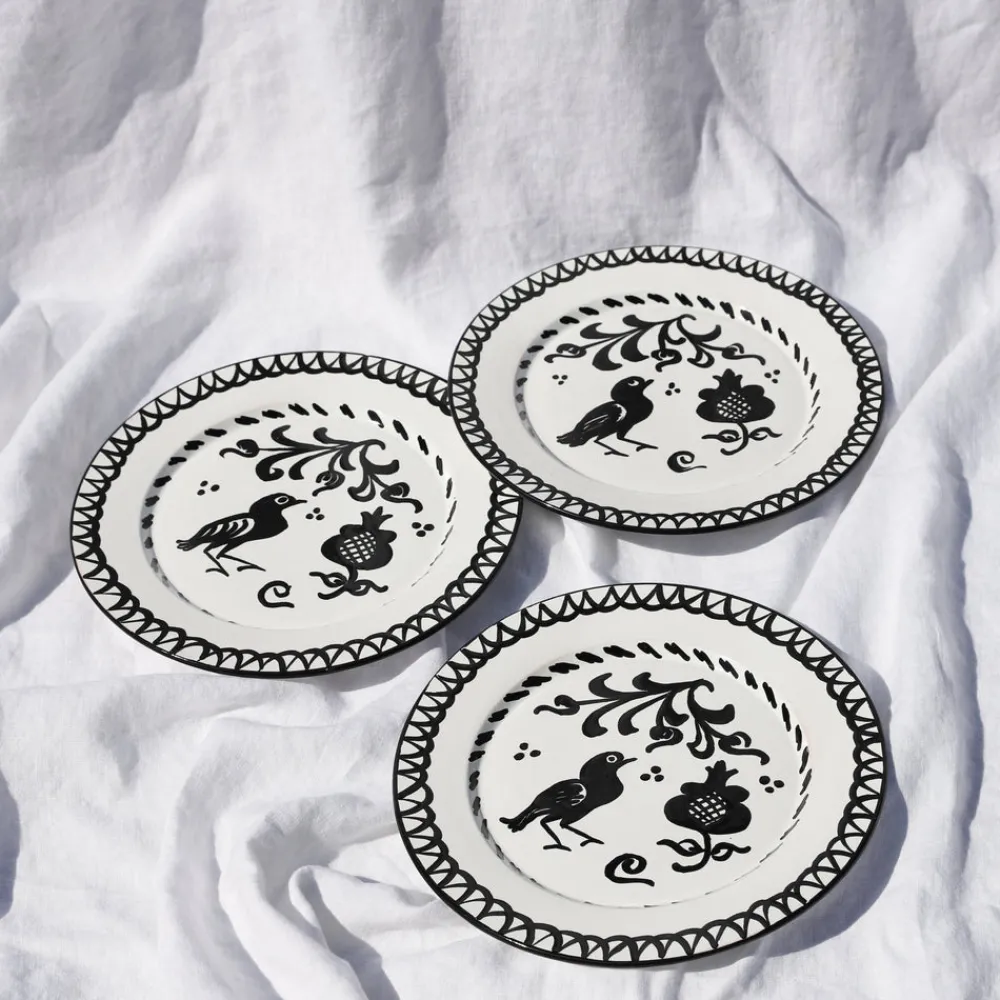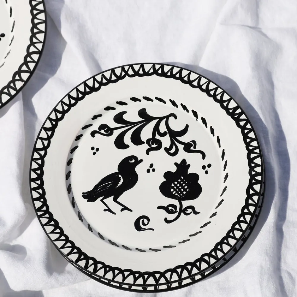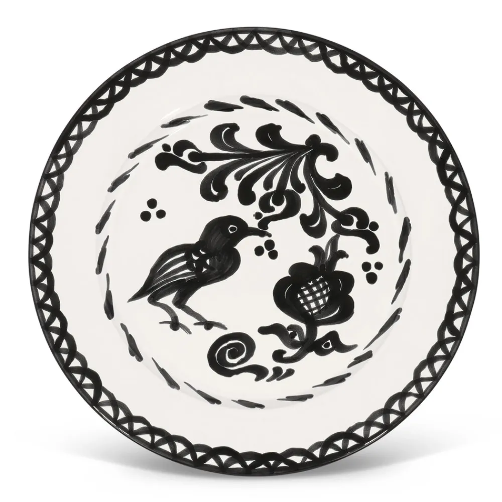 Using ancient techniques and Lebrillo motifs that date back to the 16th century, each Pomelo Casa piece is handmade and hand-painted by only five small, family-run workshops in Granada. For the first time, they are being exported outside of Europe, so that the gorgeous, simple, timeless patterns of Southern Spain can be shared with the world, making it brighter in the process. Casa Blanca & Negra Dinner Plate with Traditional Designs features pastoral scenes—birds and pomegranates—and delightful pattern in classic black and white. Because of their handmade nature, each piece may have a slight variation in pattern as a result. Minor imperfections are not considered flaws but instead add to the authenticity and charm of these beautiful home goods.