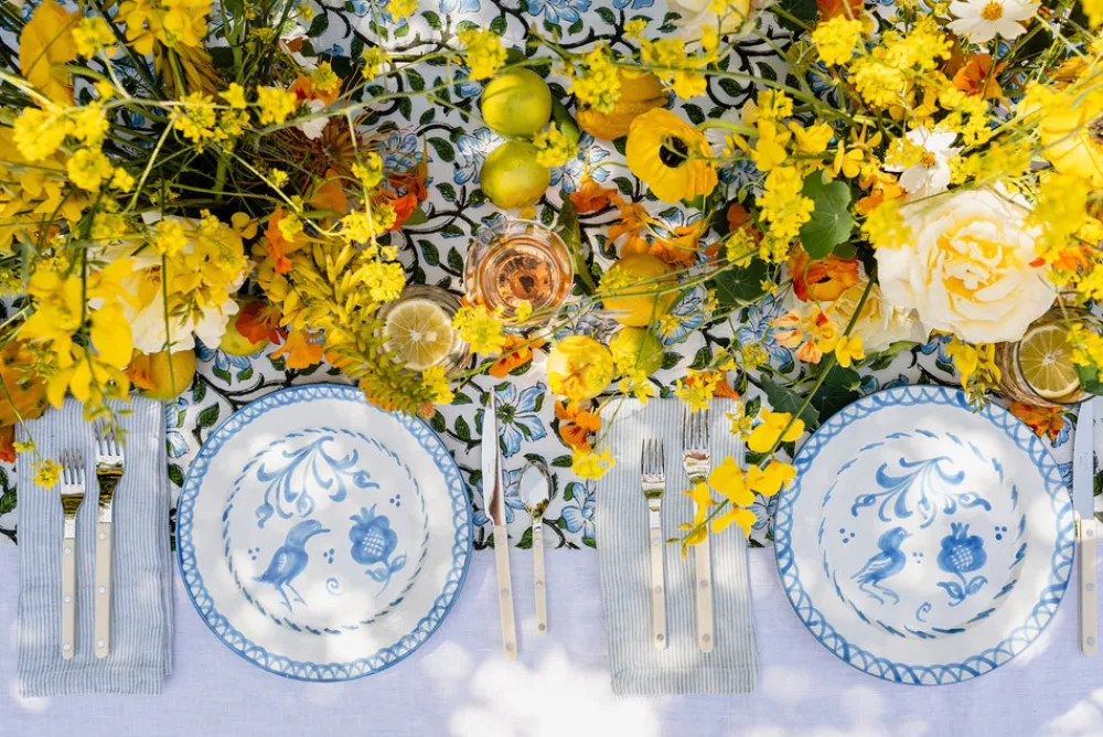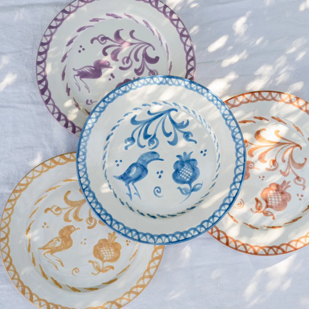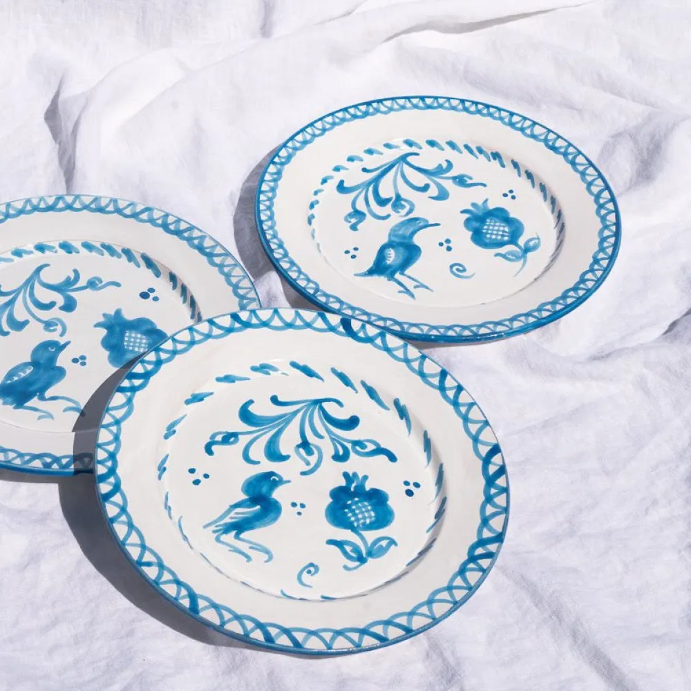Using ancient techniques and Lebrillo motifs that date back to the 16th century, each Pomelo Casa piece is handmade and hand-painted by only five small, family-run workshops in Granada. For the first time, they are being exported outside of Europe, so that the gorgeous, simple, timeless patterns of Southern Spain can be shared with the world, making it brighter in the process. Casa Celeste Dinner Plate with Traditional Designs features pastoral scenes—birds and pomegranates—and delightful trim in careful blue. Because of their handmade nature, each piece may have a slight variation in pattern as a result. Minor imperfections are not considered flaws but instead add to the authenticity and charm of these beautiful home goods.
