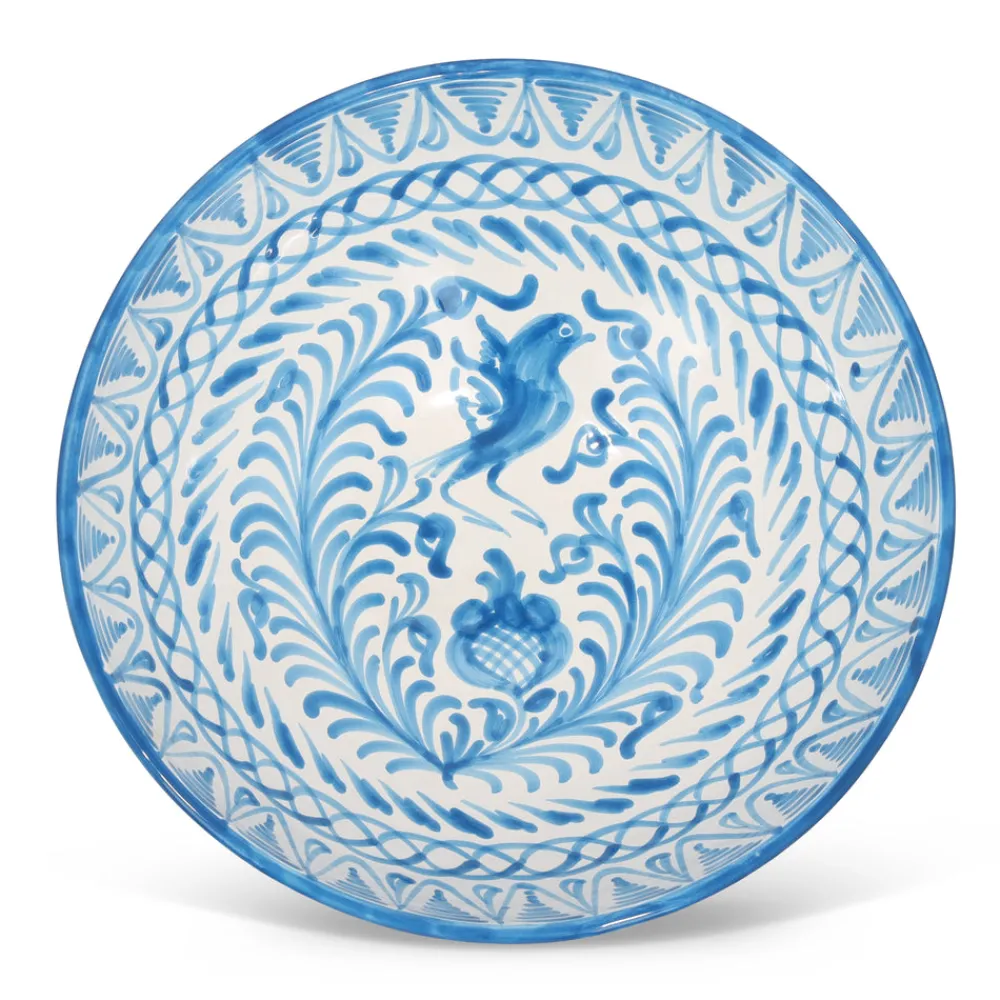 Using ancient techniques and Lebrillo motifs that date back to the 16th century, each Pomelo Casa piece is handmade and hand-painted by only five small, family-run workshops in Granada. For the first time, they are being exported outside of Europe, so that the gorgeous, simple, timeless patterns of Southern Spain can be shared with the world, making it brighter in the process. Casa Celeste Large bowl with Hand-Painted Designs features pastoral scenes—birds and pomegranates—and delightful pattern in sky blue. Because of their handmade nature, each piece may have a slight variation in pattern as a result. Minor imperfections are not considered flaws but instead add to the authenticity and charm of these beautiful home goods.