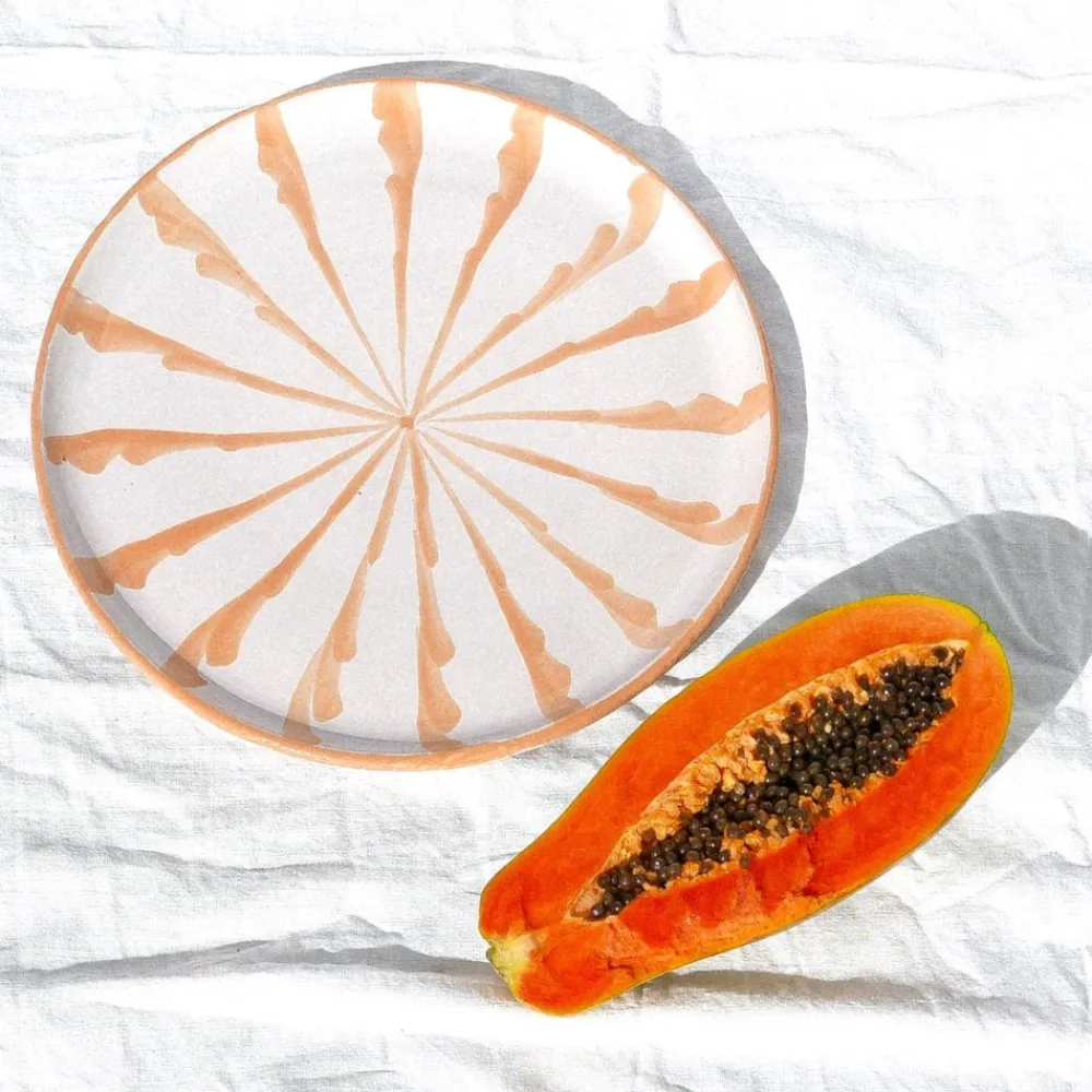 Hand-painted with a traditional candy cane stripes, the Casa Melocoton Dinner Plate is subtly striking and well-suited for dining, table decoration, or as wall decor. (There are two holes on the back that make for easy hanging.) Each Pomelo Casa piece is handmade in Southern Spain by ceramicists who have been using the same techniques for over five centuries and may have a slight variation in pattern as a result. Minor imperfections are not considered flaws but instead add to the authenticity and charm of these beautiful home goods.