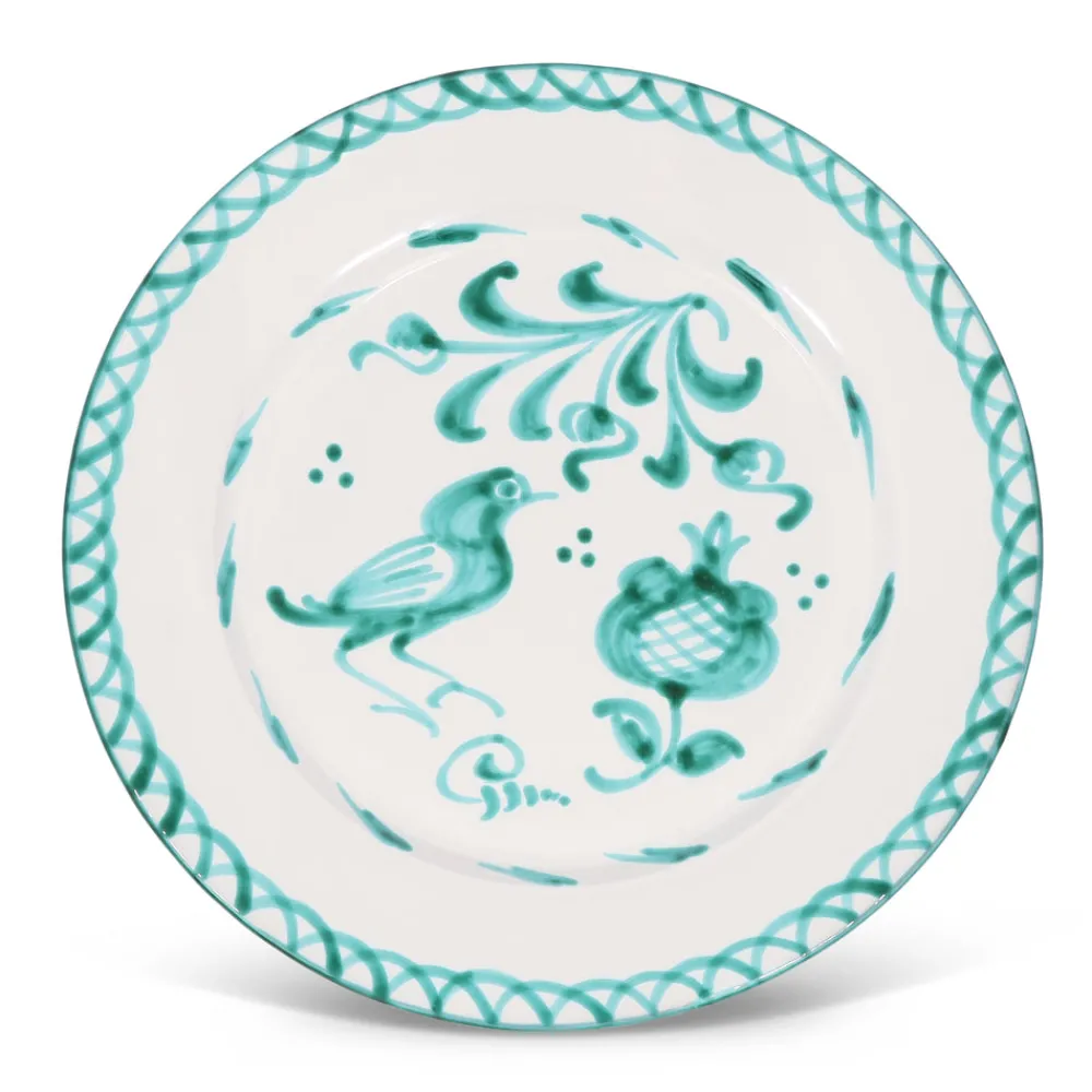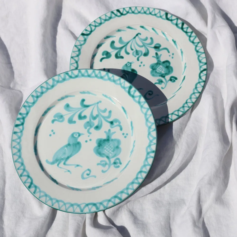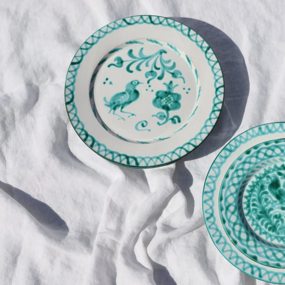 Using ancient techniques and Lebrillo motifs that date back to the 16th century, each Pomelo Casa piece is handmade and hand-painted by only five small, family-run workshops in Granada. For the first time, they are being exported outside of Europe, so that the gorgeous, simple, timeless patterns of Southern Spain can be shared with the world, making it brighter in the process. Casa Verde Dinner Plate with Traditional Designs features pastoral scenes—birds and pomegranates—and delightful pattern in a calming aqua green. Because of their handmade nature, each piece may have a slight variation in pattern as a result. Minor imperfections are not considered flaws but instead add to the authenticity and charm of these beautiful home goods.