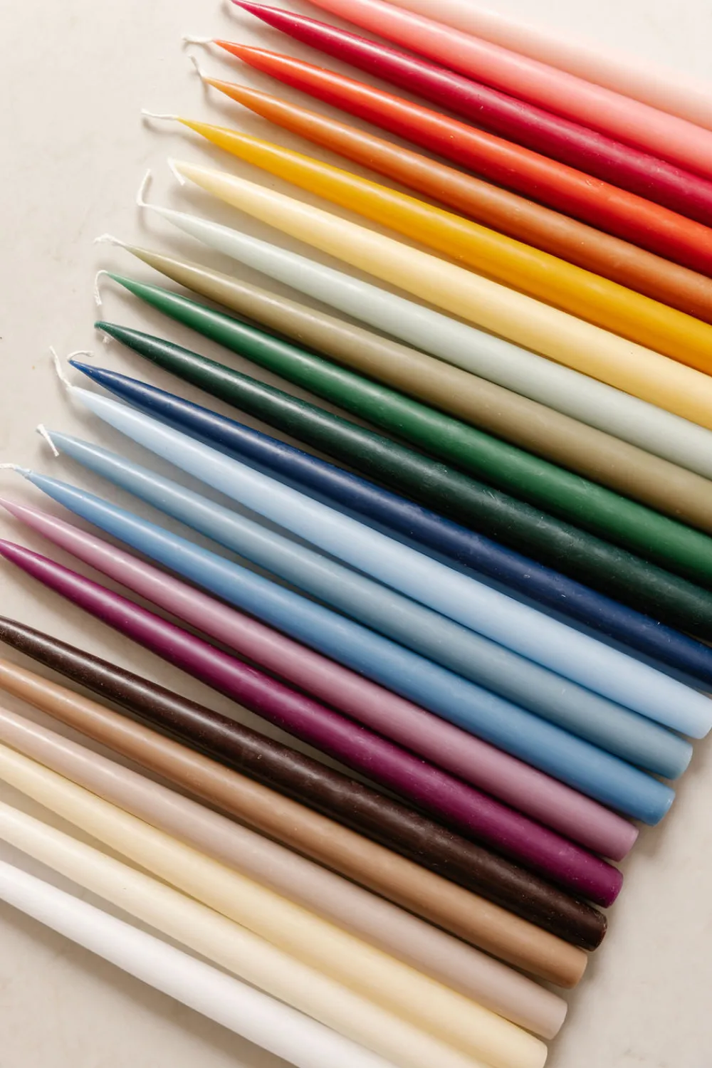 Pure and fine paraffin wax. Hand-dipped. Non-drip (avoid drafts). Gift-boxed. Long burn, up to 15 hours. Standard base, tapered, for easy fitting. Made in Denmark.