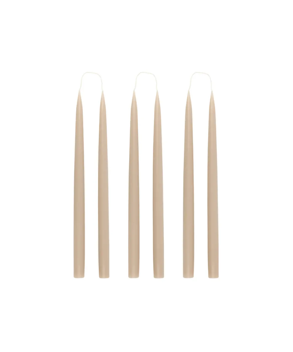 Set of 6. Pure and fine paraffin wax. Hand-dipped. Non-drip (avoid drafts). Gift-boxed. Long burn, up to 15 hours. Standard base, tapered, for easy fitting. Made in Denmark.