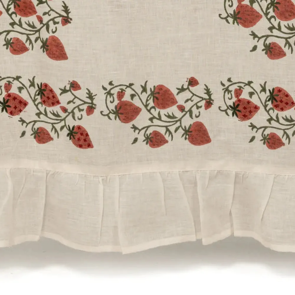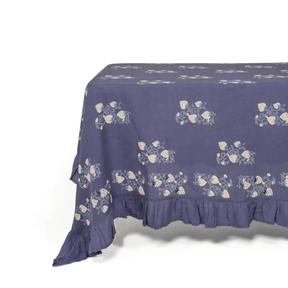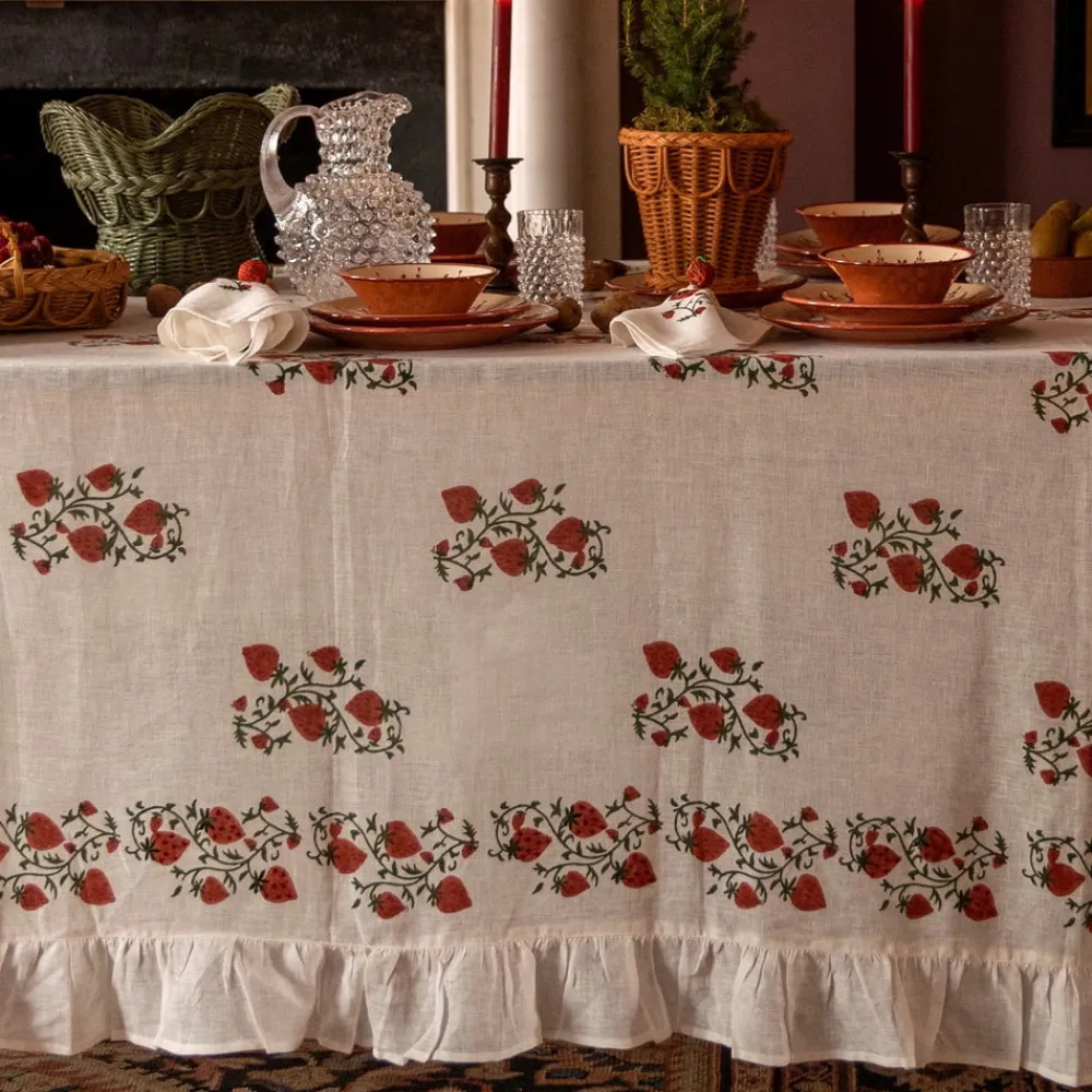 A former fashion and lifestyle journalist, Louise Roe founded Sharland England to bring inspiration and nostalgia to household items. The brand supports slow, meaningful design and traditional artisanship with tabletop, household, and rattan items built to last. Inspired by a vintage Suzani, the Fraises de Bois collection features an intricate hand-blocked pattern layered with hand-cross-stitching, with a whimsical ruffle on the borders. The Fraises Des Bois Tablecloth, adds a punch of color and a sophisticated base layer to any table and is available in cornflower blue, dusky pink, and crisp white.