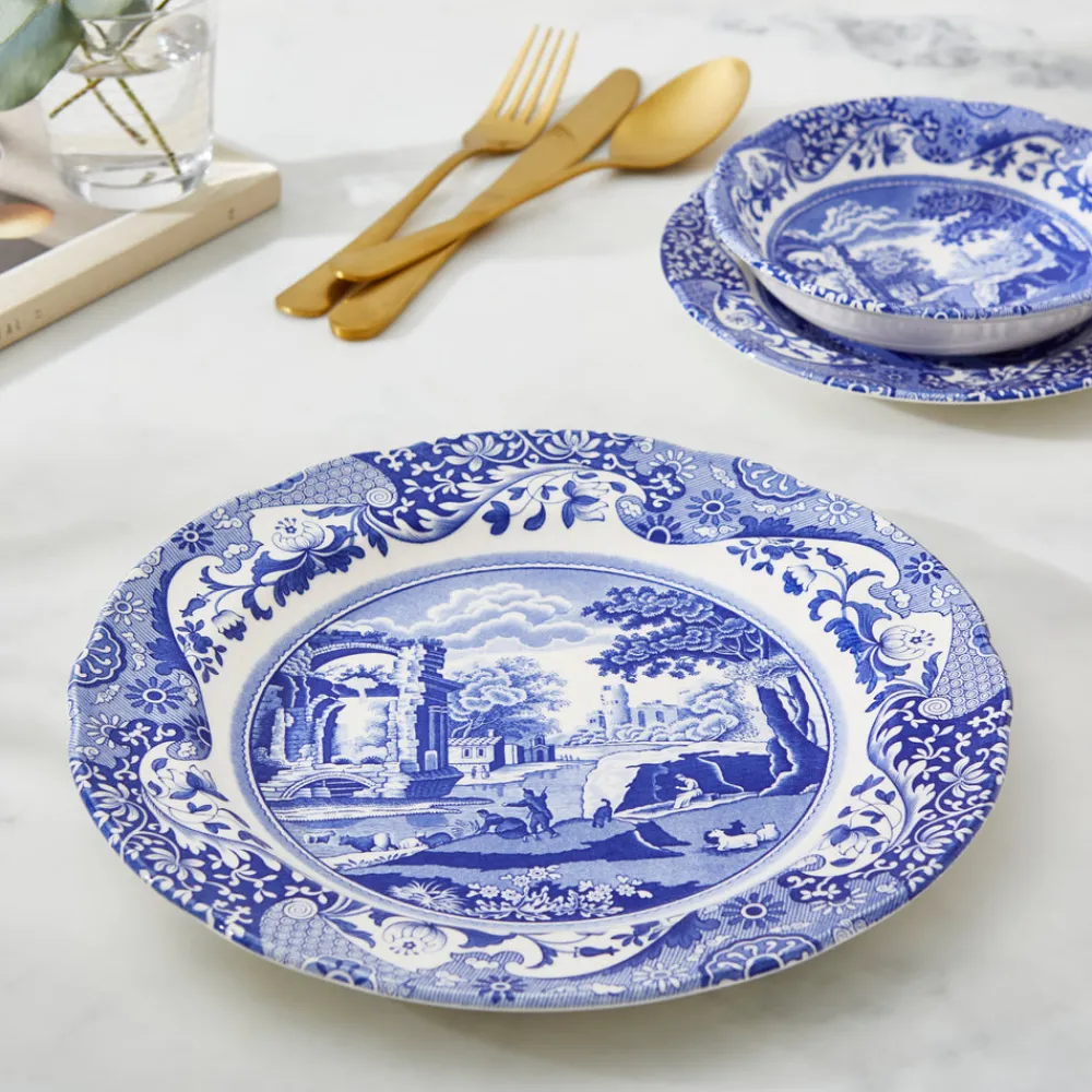 Founded by Josiah Spode in 1770, Spode has been producing the finest ceramics and celebrated designs in Stoke-on-Trent, England for over 250 years. The Blue Italian collection, introduced in 1816, is admired worldwide for its pastoral scene framed by an 18th-century Imari Oriental border. These Dinner Plates, offered as a set of four, showcase the timeless blue-and-white design that has made the collection iconic—ideal for everyday use or elegant entertaining.