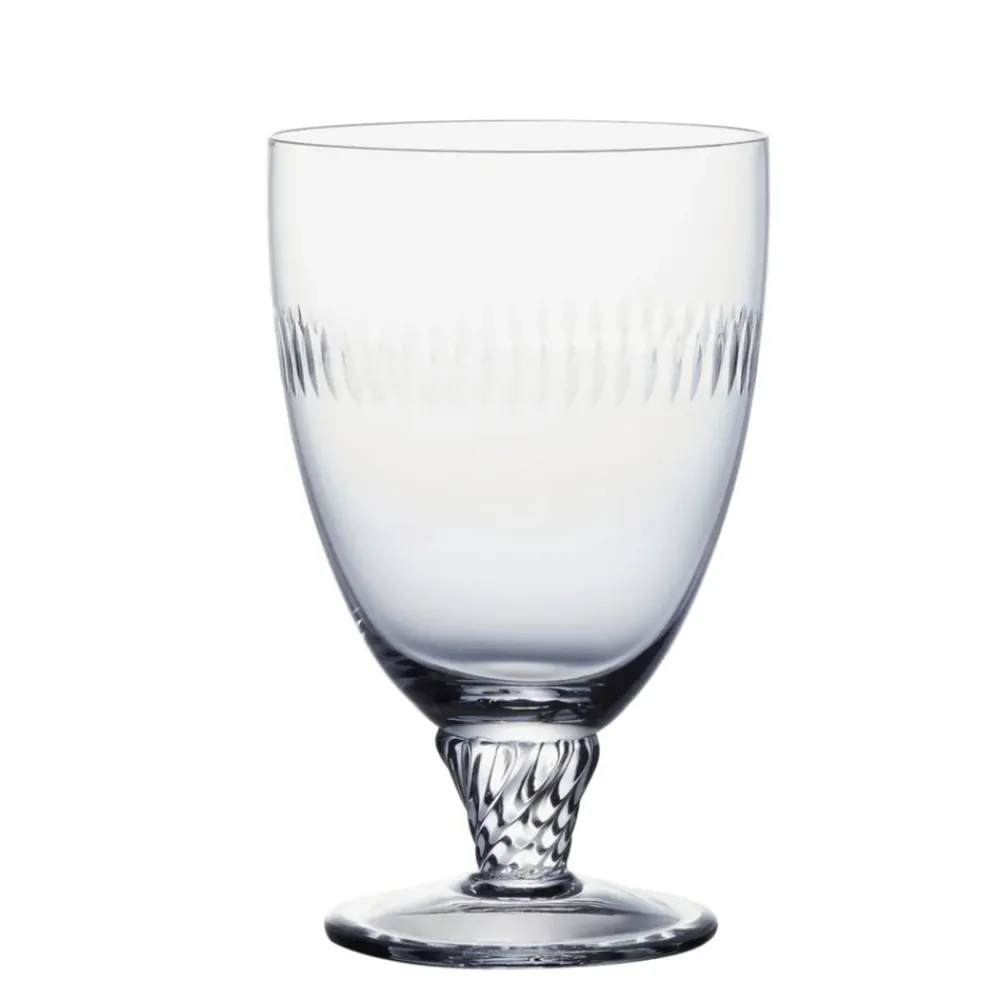 Fine crystal. Each glass has been hand-blown and hand-engraved, with a short twisted stem.