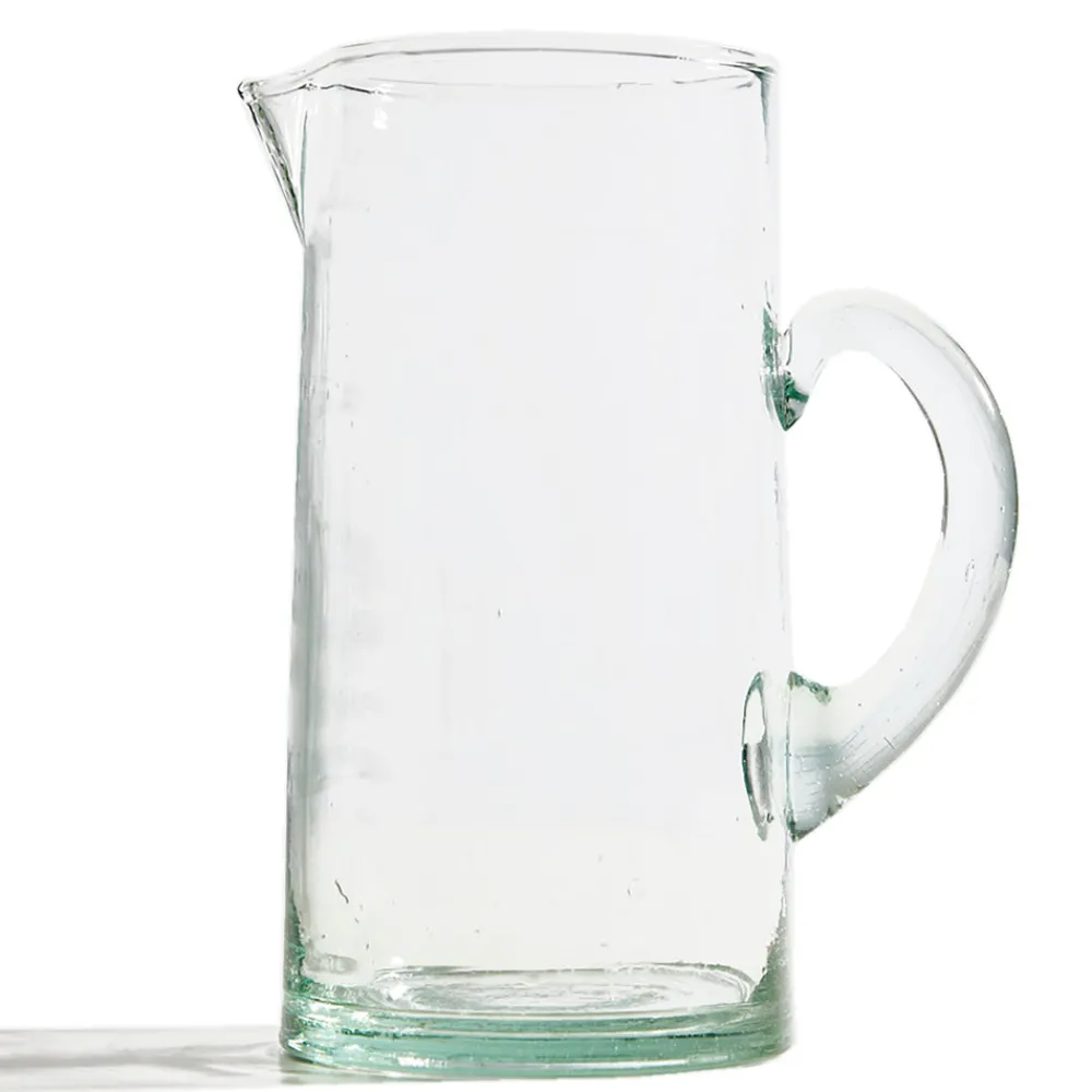Made from recycled beer and wine bottles, these beautiful jugs are a second act for glass that would otherwise be sent to landfills. The hand-blown construction is evident in the bubbles suspended in the glass itself, and the organic forms that the vessels take. Hand-blown in Morocco