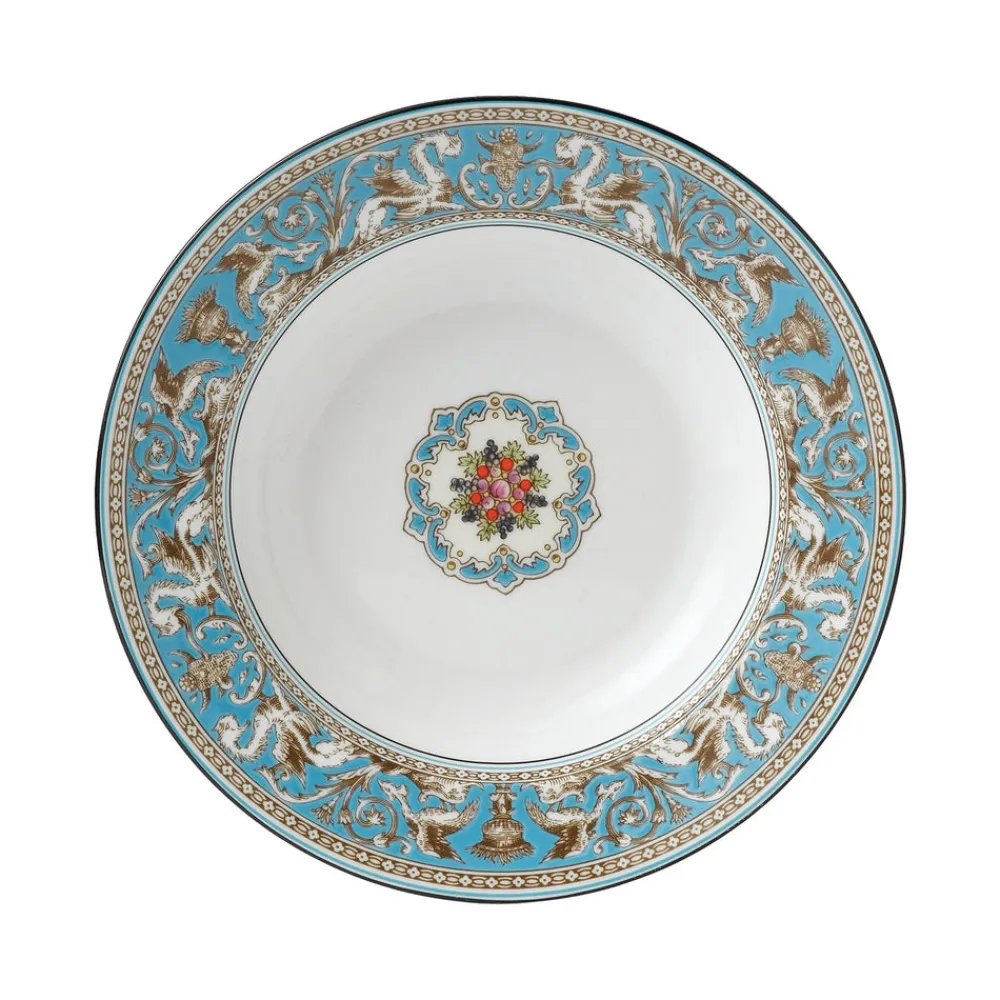 For over 260 years, Wedgwood has produced timeless, eclectic stoneware and china that has graced the tabletops of kings, queens, and some of the finest dining rooms in the world. From its factory in Barlaston, England, the brand’s signature dishware and household items are thrown, modeled and decorated by artisans who spend a lifetime mastering their craft. First introduced in 1931, the Florentine collection has mythical creatures roaming amidst fantastic flora in delicately hand-rendered motifs set against the clarity of white, fine bone china. The Florentine Turquoise Rim Soup 9″ is ideal for serving sides, salads, soups, and more.