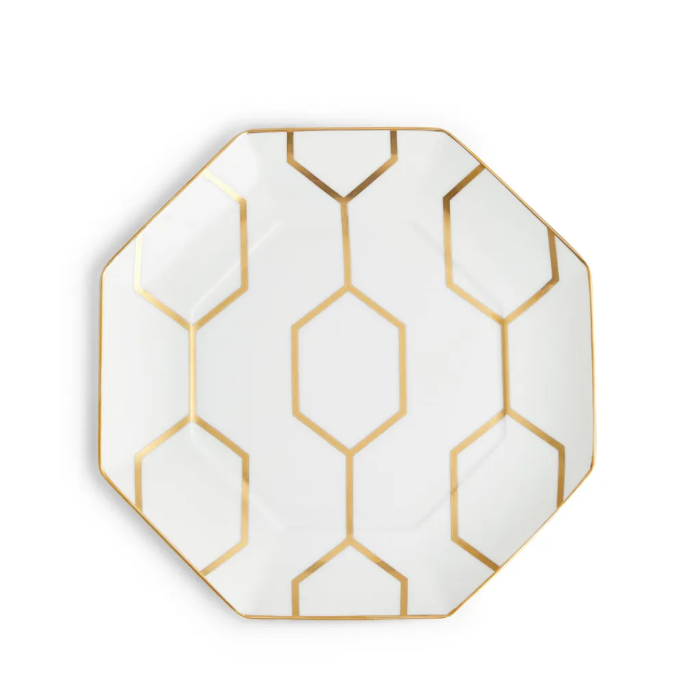 For over 260 years, Wedgwood has produced timeless, eclectic stoneware and china that has graced the tabletops of kings, queens, and some of the finest dining rooms in the world. From its factory in Barlaston, England, the brand’s signature dishware and household items are thrown, modeled and decorated by artisans who spend a lifetime mastering their craft. The minimal Gio collection features an embossed geometric pattern and is designed to be used every day, being microwave and dishwasher safe to save on the hassle when cooking and cleaning up. Containing four gold-trimmed dinner plates, salad plates, bread and butter plates, and tea cups and saucers, the Gio Gold Accent Plate Octagonal 9.1″ in White is an ideal conduit for larger dishes, like meats off a grill, family style pastas and salads, or an array of desserts.