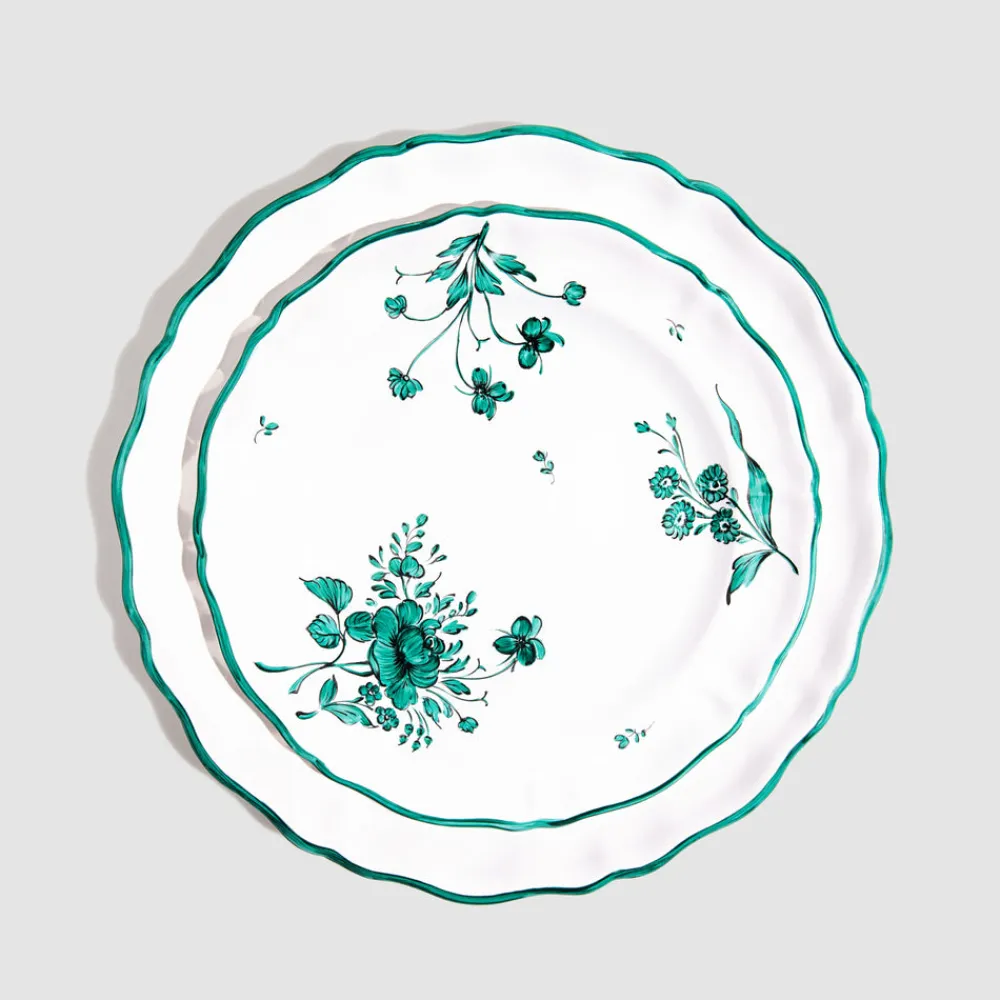 Zoë de Givenchy’s French-made ceramics, linen, and flatware display refinement above all else. This, and a certain je ne sais quoi, were gleaned from the table of her husband’s uncle, Hubert de Givenchy, the legendary couturier, and one of the century’s finest hosts. The handmade Camaïeu collection takes inspiration from its floral pattern in tasteful green from Louis XV. The Camaieu Salad Plate in Vert is ideal for salads, sides, desserts, and more.